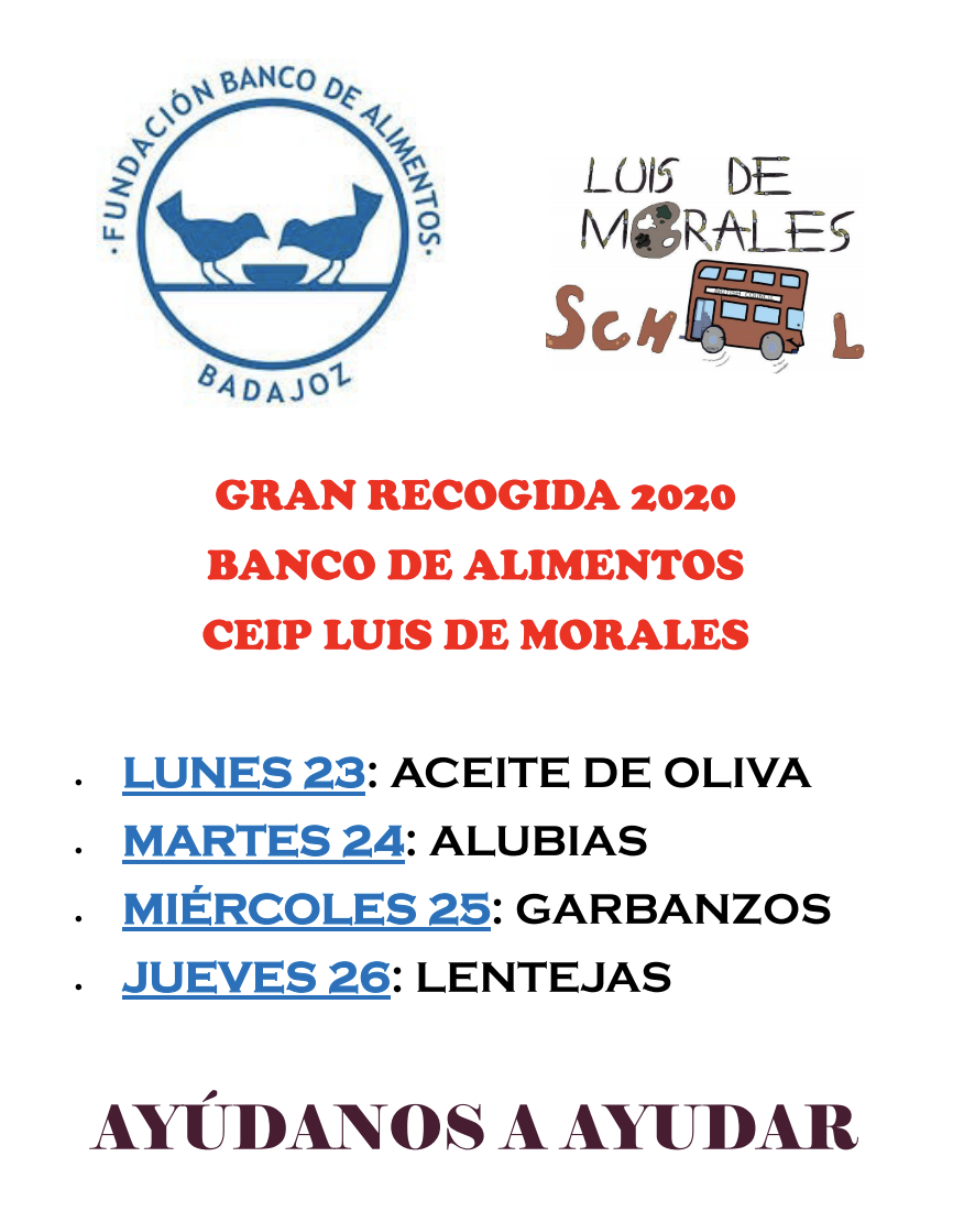 Este curso de nuevo y con motivo de la Celebración del Día Internacional de los derechos del niño, hemos celebrado una Carrera solidaria. La recaudación va dirigida al Banco de alimentos de Badajoz . Desde aquí agradecemos a todas las familias del CEIP Luis de Morales, por la gran cantidad de alimentos que han donado. Ese día nos visitó, Cristina Herrera, presidenta de la Asociación de Banco de alimentos, participando en una entrevista que dos de nuestros alumnos, de 4º de Primaria le hicieron en nuestra RADIO MORALITO. Pinchando en la imagen, se puede acceder a la entrevista.