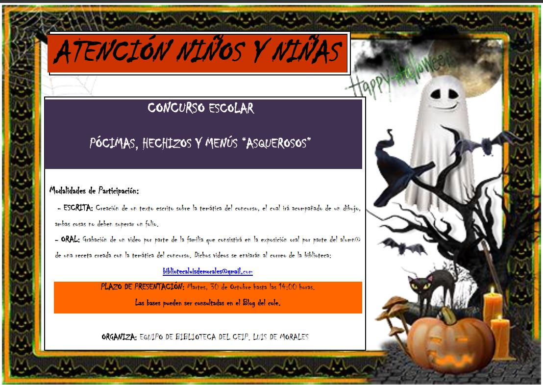 Diferentes actividades se han organizado en el centro en torno a la Fiesta del Otoño y Halloween; por niveles se han realizado fiestas con los frutos típicos del otoño, como los alumnos de Educación Infantil; para los alumnos de Primaria y desde la biblioteca las actividades han estado dirigdas a presentar pócimas realmente terroríficas. Los alumnos han creado sus propios vídeos así como otros que han elegido formato papel. Queremos agradecer a las familias su implicación y su trabajo para que esta actividad haya resultado muy satisfactoria.